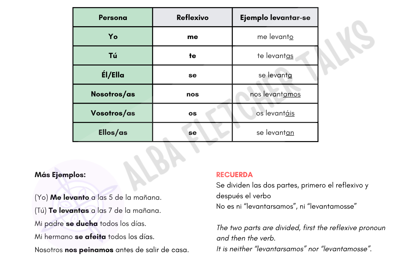 Los verbos reflexivos son los que llevan un “se” al final en modo infinitivo. «levantarse, peinarse». Significa que “te lo haces a ti mismo”.