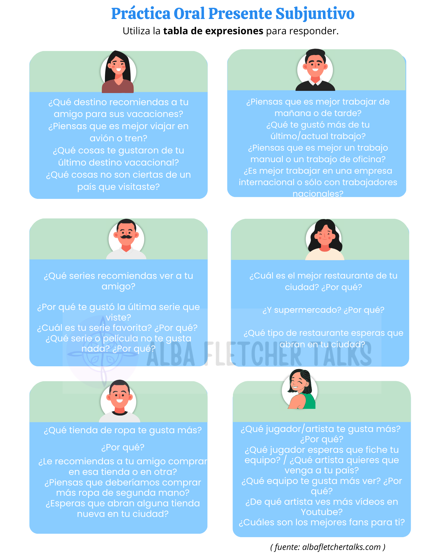 Ahora responde las preguntas en subjuntivo basándote en como lo dije y siguiendo la misma estructura.